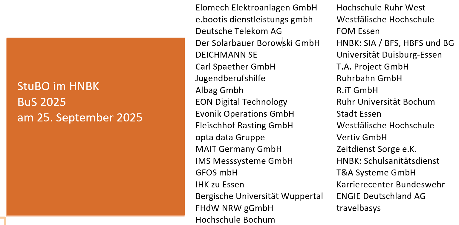 Am Donnerstag, 01.10.2026 findet in der Zeit von 09:00 bis 14:00 Uhr der diesjährige Berufs- und Studieninformationstag (BuS 2025) im Forum und in den Räumen E25 und E30 statt. Diese Bildungsmesse hat das Ziel, Ausbildungsbetriebe und Hochschulen mit unseren Schülerinnen und Schüler zusammenzubringen. Zugleich möchten wir Ihren Schülerinnen und Schülern diese Möglichkeit anbieten. Wir freuen uns auf über 30 Aussteller aus dem Bereich Elektrotechnik, Informatik und dem öffentlichen Dienst.