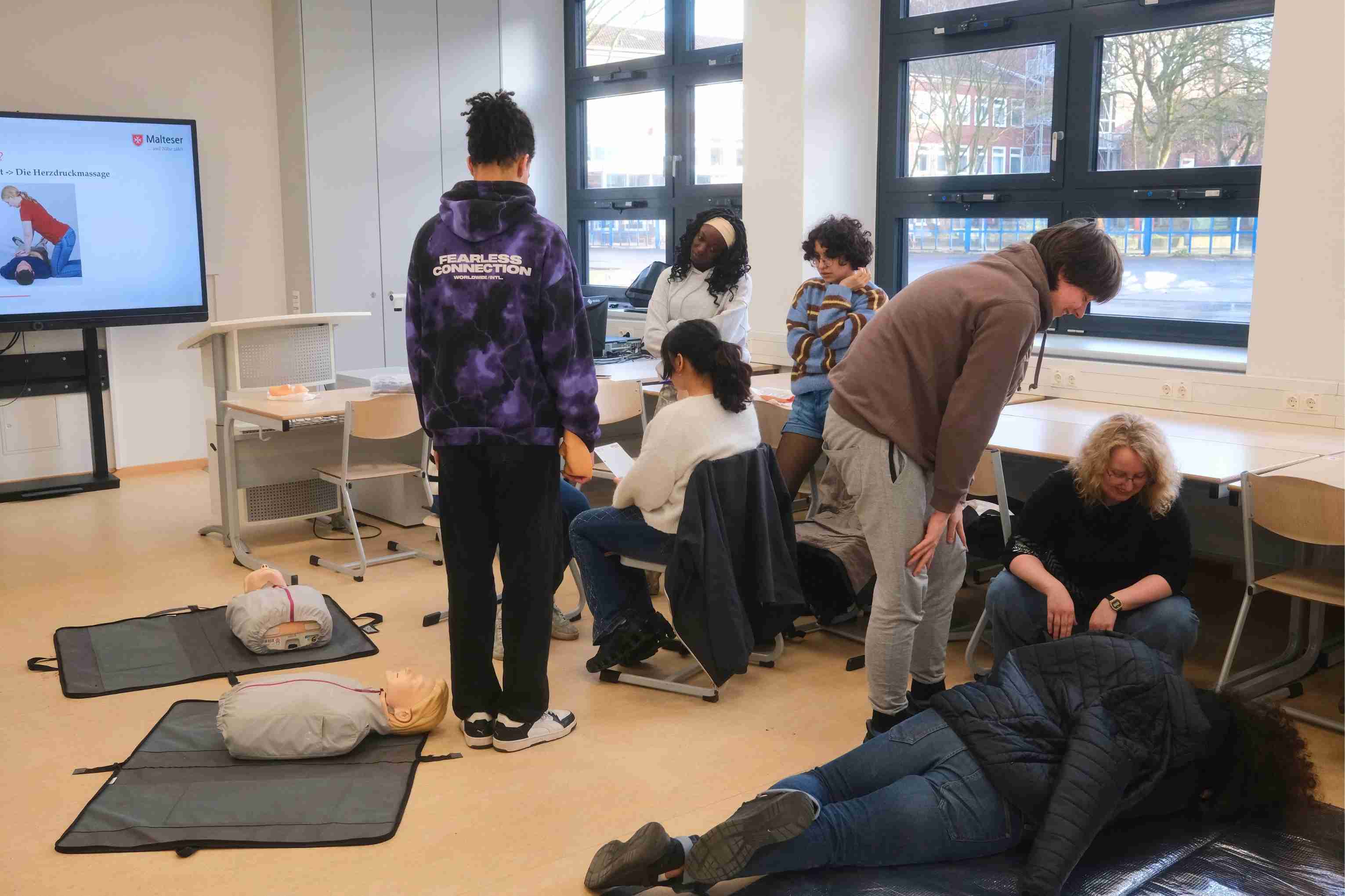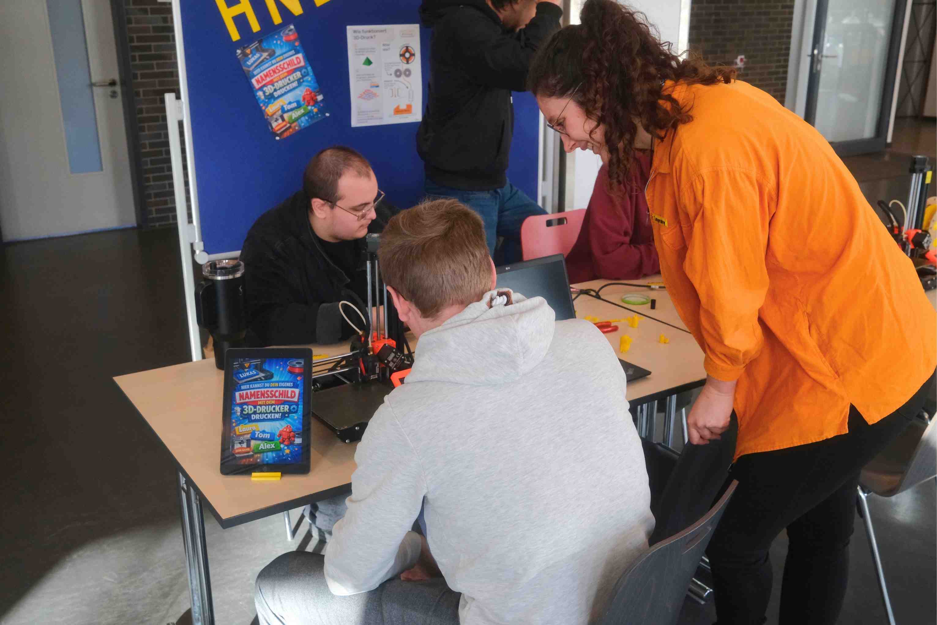 Besonders begeistert zeigten sich die Gäste von der Live-Demonstration der 3D-Drucker: Frau Tangerding und eine Gruppe engagierter Schüler aus der höheren Berufsfachschule fertigten vor Ort personalisierte Namensschilder an. Des Weiteren konnten Interessenten einen von Schülern aus dem Beruflichen Gymnasium selbst gebauten und programmierten Roboter per Controller steuern. Ein weiteres Highlight war die Vorstellung des Schulsanitätsdienstes, der vor zwei Jahren am HNBK ins Leben gerufen wurde. Besucherinnen und Besucher konnten einen laufenden Lehrgang in Zusammenarbeit mit den Maltesern Essen beobachten und sich über die wichtige Arbeit der engagierten Schülerinnen und Schüler informieren.